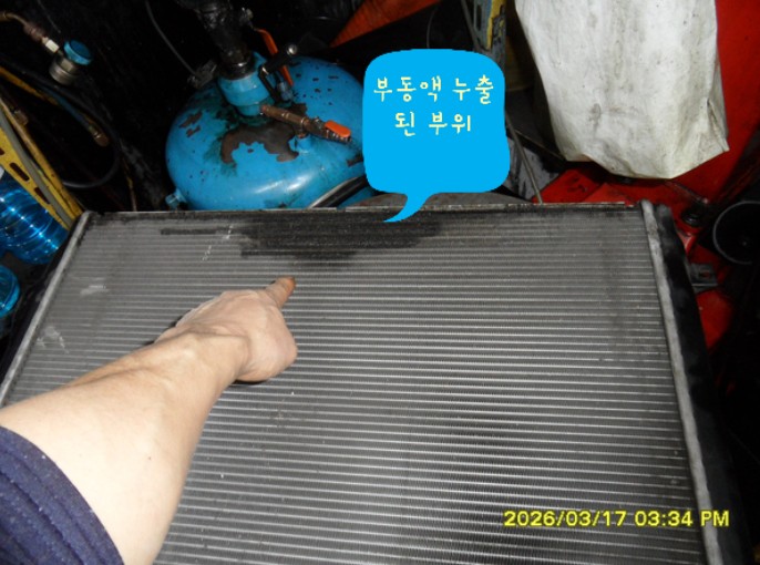 정밀 점검 결과, 라디에이터 코어의 파손으로 인한 냉각수 누수가 확인되었습니다. 라디에이터는 엔진 냉각 시스템의 핵심 부품으로, 파손 시 엔진 과열을 유발할 수 있습니다.