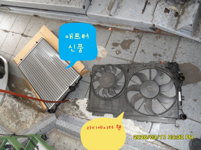 세 번째 사진은 교체될 신품 라디에이터와 라디에이터 팬의 모습입니다.